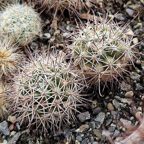 | Randdornen 11 - 12, 8 - 10 mm lang, dünnadelig, weiß, anfangs rötlichbraun, dann weiß | |